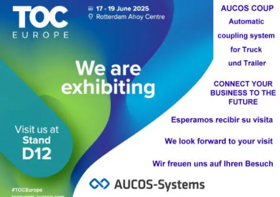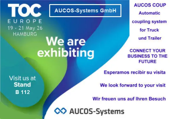 TOC EUROPE 2026 in Hamburg 19 until May 21 2026 Our sales company AUCOS-Systems GmbH will be there at booth B 112, exhibiting our new and innovative developments in the field of trailer coupling technology. Container transport, automatic coupling and uncoupling of trailers, time savings, reduced environmental impact, and safety are our top priorities. We look forward to seeing you there. The AUCOS Systems team